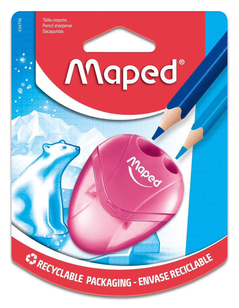 Keep your pencils sharp with the Maped Igloo 2 Hole Pencil Sharpener! Featuring 2 high quality steel blades, this classic sharpener makes it easy to sharpen any standard or jumbo sized pencils to a precise tip. The ergonomic design fits easily in your hand for a solid hold during sharpening, and the integrated canister keeps shavings trapped. Transparent, shatter resistant construction makes it easy to see when you have to empty the integrated shavings canister. Comes in assorted colors (Blue, Green & Pink) and cannot be chosen at this time.