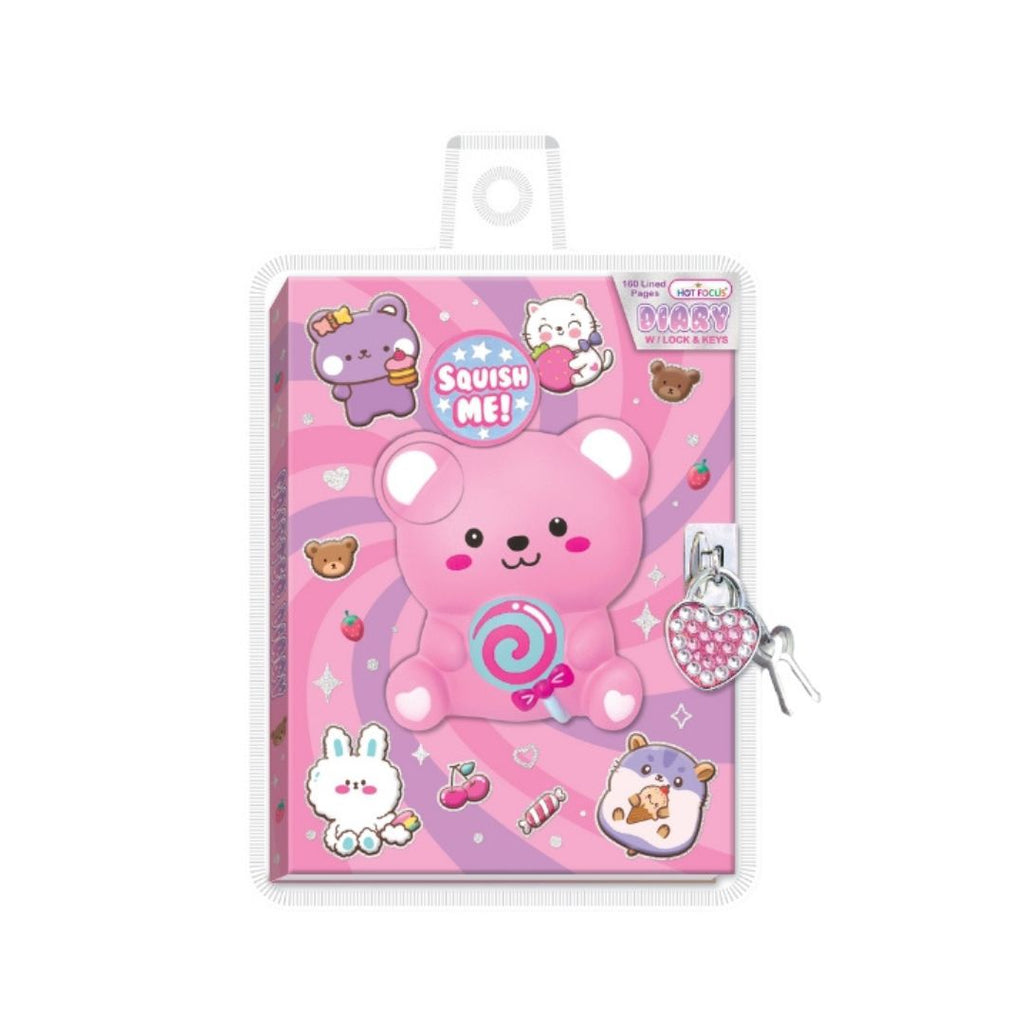- Add a dose of sweetness and fun to your journaling with the Kawaii Squishy Bear Lockable Diary. Featuring an irresistibly soft, squishy pink bear holding a lollipop on the front cover, this diary offers both a sensory delight and a burst of kawaii charm. Decorated with candies, strawberries, cherries, bunnies, and hamsters on a dreamy pink and purple pastel background, it’s perfect for capturing thoughts, doodles, and stories. With a heart-shaped jeweled lock and two keys, your secrets stay safe, while 160 lined pages provide ample space for creativity. Beautifully packaged, it makes an ideal gift for kids aged 5 and up.